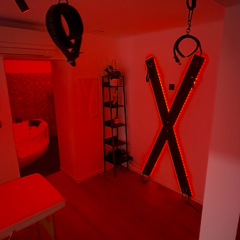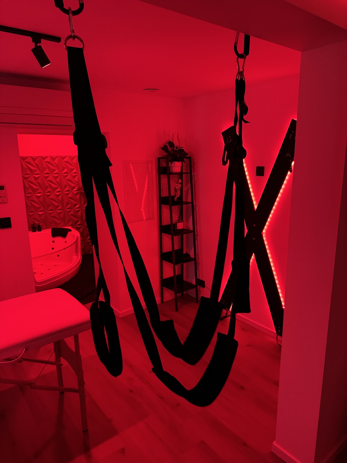 Et pour ceux qui souhaitent explorer une expérience plus sensorielle, la chambre dispose également d’un sofa tantrique, d’une croix de Saint-André, ainsi que de crochets discrets permettant d’utiliser les menottes et une balançoire, le tout intégré avec esthétisme et raffinement.