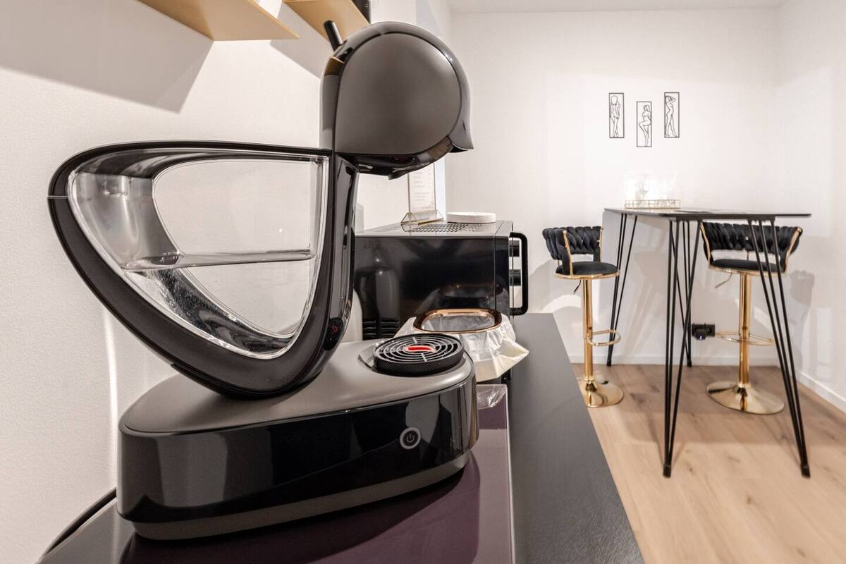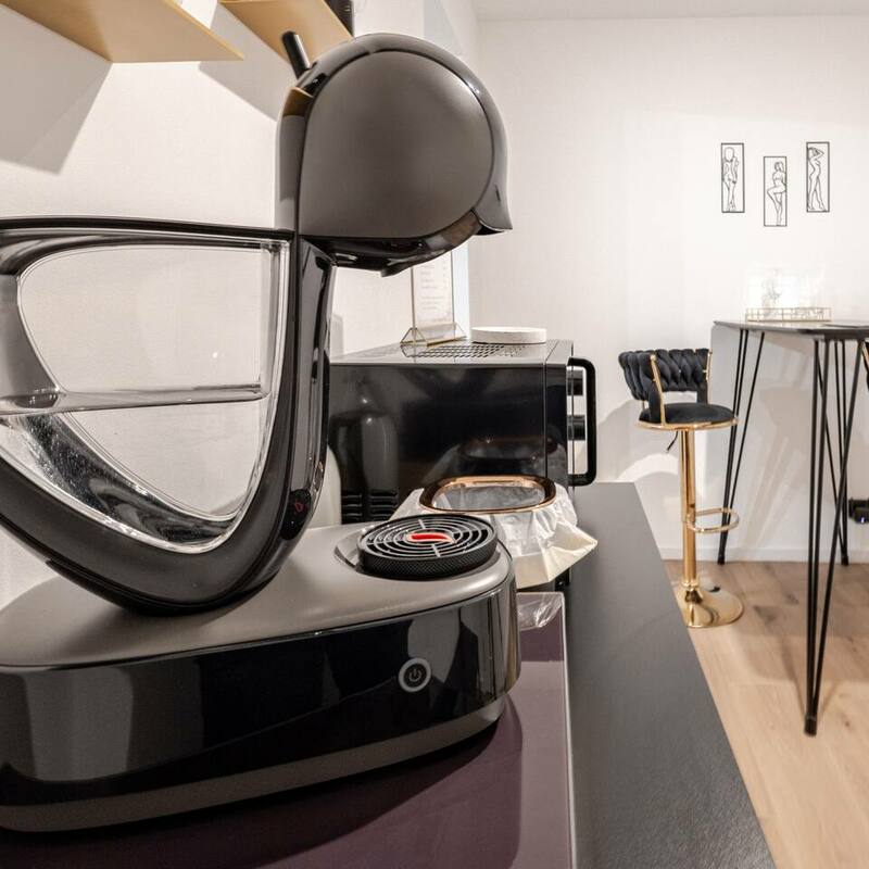 Un espace d’accueil équipé d’une machine à café, d’un micro-ondes, d’une table et de chaises pour vos petites pauses