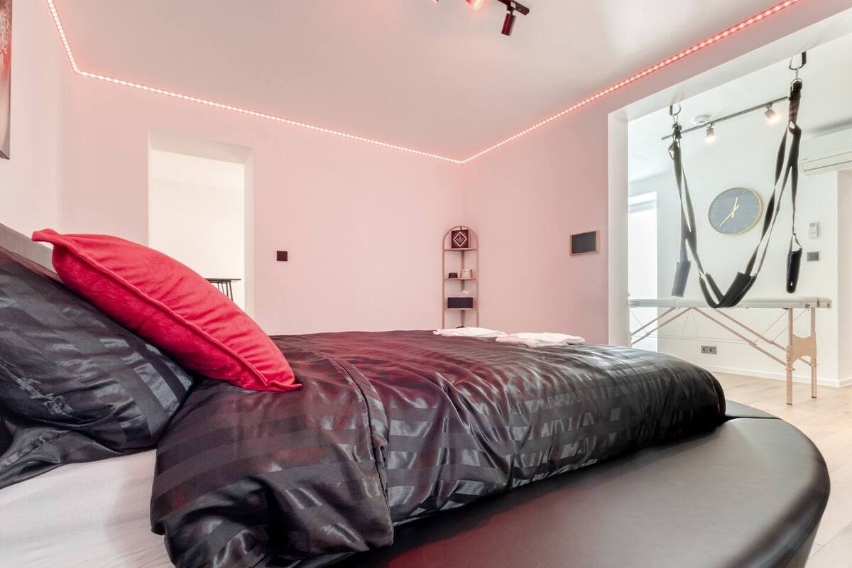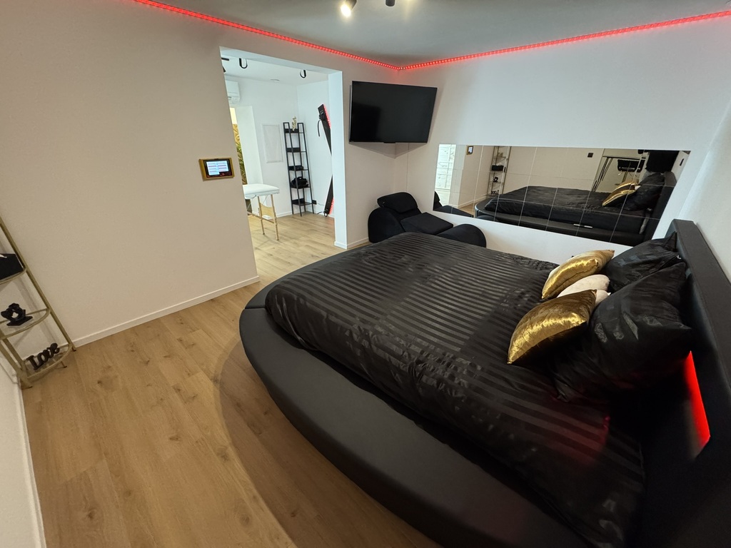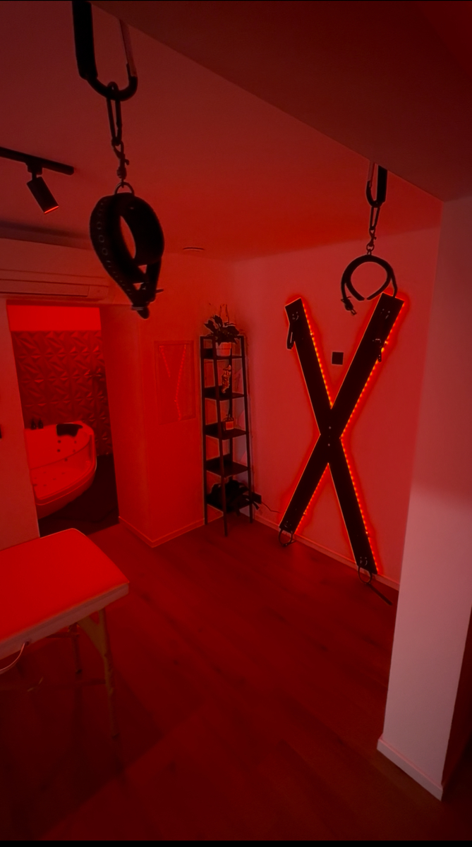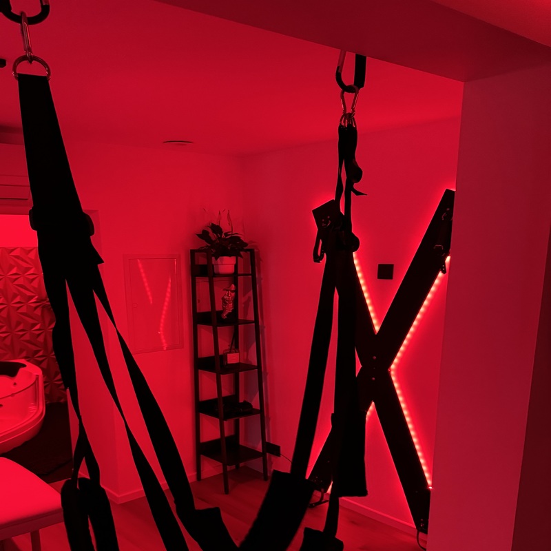 Et pour ceux qui souhaitent explorer une expérience plus sensorielle, la chambre dispose également d’un sofa tantrique, d’une croix de Saint-André, ainsi que de crochets discrets permettant d’utiliser les menottes et une balançoire, le tout intégré avec esthétisme et raffinement.