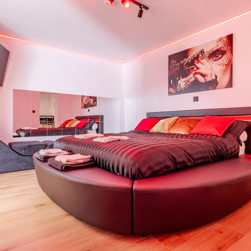 Cette LoveRoom est un véritable cocon pour les couples, alliant romantisme, confort et curiosité, dans un cadre chaleureux et soigné.